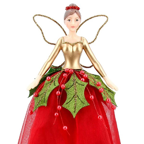 - This tree topper fairy is simply stunning with her bright red and gold design embellished with holly and berries