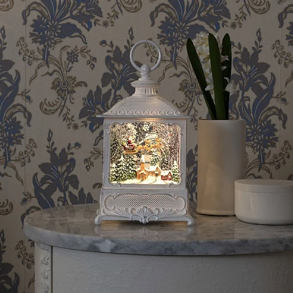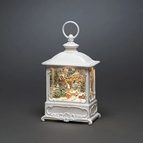 - Konstsmide Santa Over Village Water Lantern (Battery Operated) is a Christmas decoration to treasure, with a beautiful scene held within an old-fashioned style white lantern and lit with warm white LED lights