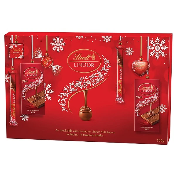 - It contains a magnificent 500g selection of Lindor milk chocolates, including truffles, hearts, squares and bars