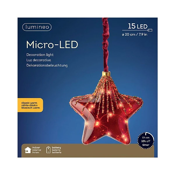 - The 20cm red glass Christmas star bauble features glitter crusted detailing on the outside and 15 warm white LEDs on the inside to create an opulent decoration at any time of the day