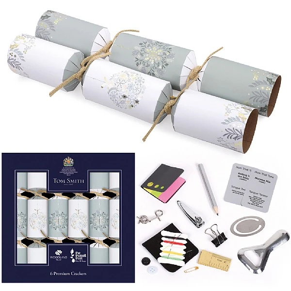 Why We Love It:Set of 6 premium Christmas crackers in contemporary grey green and white with a winter foliage design finished with natural bowsContains a hat, motto and plastic-free giftFSC-certifiedTom Smith has partnered with the Woodland Trust to actively support a sustainable futureThe manufacturer also donates money to the Trussell TrustFully recyclable packagingSince 1906, Tom Smith has held the Royal Warrant as suppliers of Christmas crackers and wrapping paper to the monarch